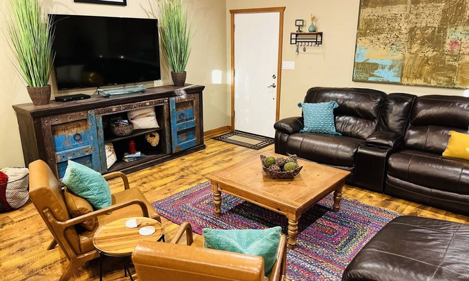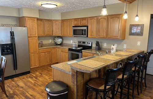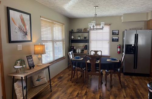 Enjoy the quaint town of Norfork, Ar! This home offers everything you need to have a fabulous weekend or vacation stay! Sleeps 7 comfortably! We also have a pack-n-play and a twin size air bed both complete with linens. Each bedroom has its own private bath, in addition to a half bath and laundry room in the hallway. Each bedroom has a smart tv and a 65” smart tv in the living area. TVs are set to guest mode so you will be able to log in safely to your current subscriptions! The living room area is stylish and comfortable and is open to the kitchen and dining area. The kitchen has a dining table and a 4 seat bar and everything you need to make a delicious meal! Step out to the wrap around deck and enjoy a bbq on the gas grill and eat outside and listens to the birds! Later in the evening, enjoy a nice fire and make s’mores in the fire pit area! You are a 2 minute walk to the confluence of the Norfork and White Rivers, and a 4 minute drive to Lake Norfork access and the Norfork dam. The eateries are in walking distance from the home! The Norfork Cafe offers a delicious breakfast all day! Heidi’s Ugly Cakes and Sandwiches offers fantastic homemade desserts and the best Reuben around! The Norfork Brewery will be a favorite and the pizza is amazing!! The town and neighborhood are quite and peaceful and offer that hometown feel everyone loves! There are so many things close by and so many beautiful sights to see!