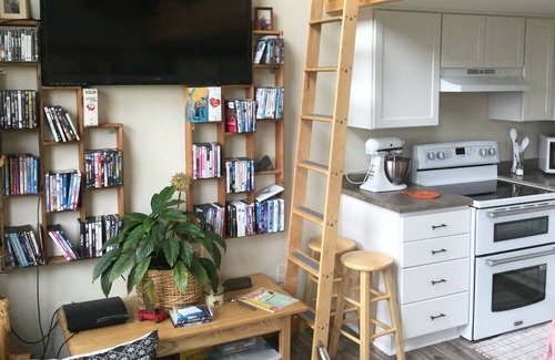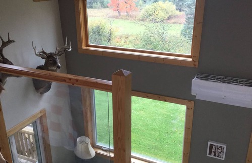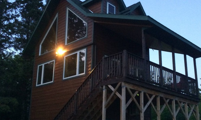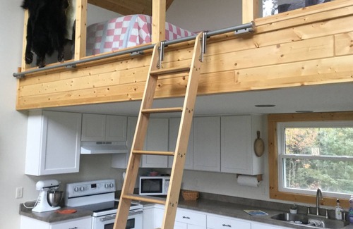 Small but tall. This is a 780 sq ft 3 story cabin in the woods 1/2 mile from the Brule River. The first floor has a bedroom with a full size bed, stackable washer and dryer in hall with a full bathroom (shower). The second floor is a combination kitchen living area, along with a 10 x 20 covered deck. The third floor is a loft with two fulls size beds with glass panels allowing great views out the big western facing windows. In keeping with the small size and having as much livable space as possible, the stairs from the first floor to the second floor is from a lower walkway to the covered deck on the outside of the building. There is a sliding library ladder on the second floor to access the third floor loft. Fire pit and wood available for a relaxing evening. Enjoy coffe in the morning with many of nature’s friends.