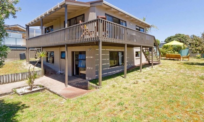 This 2 storey Omaha holiday home includes spacious open plan living upstairs, with fantastic outdoor flow onto the deck... Enjoy your morning coffee as you gaze at the sea views! The generous, private backyard is the perfect spot for classic kiwi BBQ's, with ample room to unwind and spend time with your group...