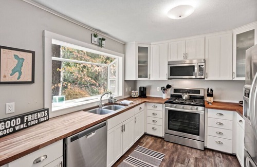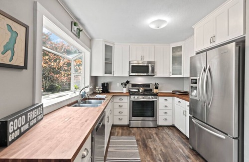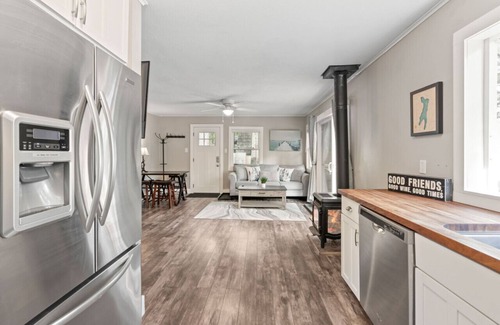 When you step inside this beautifully remodeled cabin, you will be greeted with an open concept floorplan complete with a fully equipped kitchen, living room with a smart TV and high quality throws to cozy up with, a fireplace, boardgames, a full bathroom with a walk-in shower (stocked with the needed essentials for your stay), and two bedrooms- one which is the primary bedroom with a queen bed, and the other room has a bunk bed with a double sized bed on the bottom and a double sized bed on the top. You will be feeling at home from the moment you arrive!