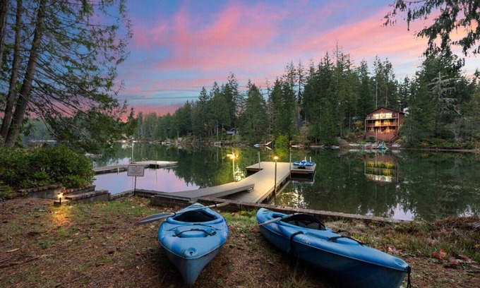 Escape to a serene waterfront retreat on Wye Lake! Nestled in the outskirts of Port Orchard, Washington, this charming 2-bedroom cabin is surrounded with natural beauty and offers a peaceful haven for couples, families or small groups seeking an intimate lakefront vacation experience. The cabin is tastefully furnished and features breathtaking views of the lake and its own new private dock. There's plenty of seating, a firepit, picnic table, BBQ, a pedal boat and 2 kayaks for your enjoyment!