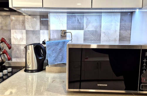 Open Kitchen & Dining: Prepare meals with ease in the open kitchen, equipped with a refrigerator/freezer, cooker, gas stove, kettle, and essential kitchen utensils.