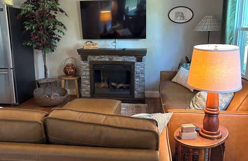 Step inside to find a thoughtfully updated space, blending modern amenities with rustic charm. The open-concept living area features warm wood accents, a comfortable sleeper sofa, and a flat-screen TV ideal for unwinding after a day of exploring. The fully equipped kitchen boasts brand-new appliances, and everything you need to prepare meals for your group, whether you're cooking a full dinner or enjoying a cup of coffee on the private porch.
