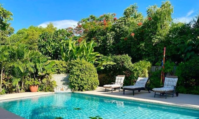 Indulge in the island's allure without sacrificing modern comforts. Take a refreshing dip in the crystal waters of our aquarium-themed swimming pool, surrounded by lush tropical greenery, while listening to the hypnotic sounds of the waterfall. Lie on comfy lounge chairs, sipping your favorite tropical drink as you bask in the Bahamian sunshine.