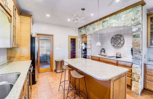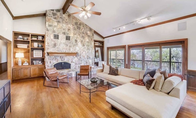 The outside is calling, but so is the inside. This 3,929 square foot, 5 bedroom, 3 bathroom home is filled with classic wood floors, Saltillo tiles, limestone fireplaces, floor-to-ceiling stone, and covered verandas with splashes of modern art and modern amenities throughout. Each individual suite has been styled with comfort in mind and can sleep up to 12 guests in total.