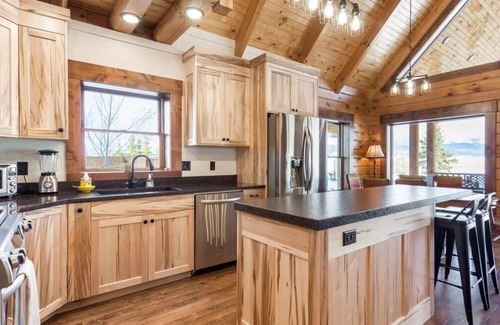 The 2-story timber-frame cabin has large, vaulted ceilings with giant windows facing East towards the mountains. Use the spotting scope to get a close-up look of the Grand Teton or watch skiers go down Grand Targhee. The new 4K picture-frame TV over the fire mantle on the main floor has beautiful, crisp video quality. There are 2 laptop working stations with office chairs, monitor, and printer. The home has fast internet. Handrails everywhere make this a suitable home for senior citizens and can accommodate a wheelchair. The master bedroom has its own bathroom with a shower with bench. Every bathroom has a separate room for the toilet. There isn't a single piece of drywall in this house, as all the walls are made of cedar or fir. In the living area / loft upstairs there is a second TV, 2 additional couches, a small cubby with a pack n play crib, a bedroom, and a bathroom. There is central air with heating and air conditioning, and a fire pit for evening entertainment. You may park in front of the garage. Washer and dryer included. All the kitchen amenities, linens, and everything you need to enjoy your vacation are included in the home.