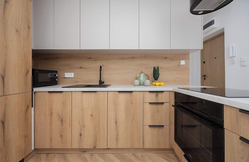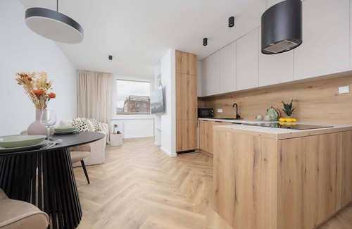 This cosy apartment located on the fourth floor is ideal for those who value comfort, aesthetics and functionality. The bright, spacious interior has been carefully designed to promote relaxation during both short and longer stays. The bedroom features a comfortable double bed for a good night's sleep, while the living room has a sofa bed for two people, creating additional sleeping space. The kitchenette is equipped with all the necessary appliances for preparing home-cooked meals, including a hob, oven, dishwasher and dining area. A great advantage of the apartment is the balcony with a set of garden furniture – an ideal place for morning coffee or evening relaxation with a view of the surrounding area. The bathroom is equipped with a shower, toiletries and fresh towels. Additional amenities include high-speed WiFi, a flat-screen TV with Smart TV functionality – making both remote working and relaxing with your favourite series a pleasure. The apartment can accommodate up to 4 people and is an excellent base for exploring Warsaw with a comfortable return to a modern interior.