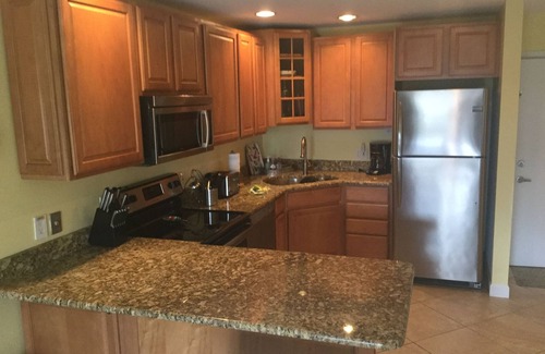 Our totally updated condo is located in a 24 hour security gated community. Upon your arrival, you will be greeted with beautifully groomed grounds and a myriad of amenities to provide you with a wonderful experience. There are 5 heated swimming pools, hot tub, 6 shuffle board courts, 3 bocce ball courts, 10 tennis courts, a 9 hole- par 3 executive golf course, and a fitness center with sauna . A Tiki Bar is located adjacent to one of the pools, and there is also a restaurant available on site. Or you can just relax on the 3,000 feet of private ocean beachfront . Our second floor condo has a King Bed in the master bedroom, ceiling fan, and flat screen TV. The living room has a couch and ottoman. Comfortable chair and coffee tables, flat screen TV with a DVD/Blue Ray player. Cable and high speed WIFI is provided. The kitchen is fully stocked with all new appliances and accessories. Linens are provided for the unit, including beach towels. A washer and dryer are also in the unit. There is an enclosed lanai with seating for quiet evenings overlooking the water and water courtyard fountain. Whether you are looking for an activity filled month or a time for relaxation and rest, you will be truly satisfied vacationing at our lovely Ocean Village condo. Please review the rental agreement on the VRBO site.