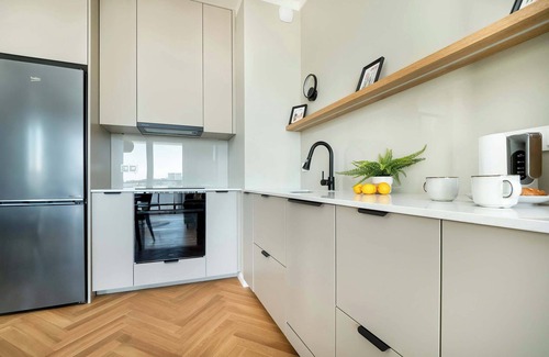 This modern building is located in an atmospheric, quiet and friendly neighborhood, making it the perfect place to relax for parents traveling with children and couples looking for an intimate atmosphere. Motorized guests have a parking space located in the underground garage, and there are bicycle racks at the property. Only a 1-3 minute walk from the property are located as many as three children's play spaces, as well as a charming fountain. The nearest grocery store is a minute's walk away, allowing guests to conveniently stock up on essentials. Fans of local commerce can visit the nearby bazaar. It takes about half an hour to get to the center of the capital and the city market with its beautiful architecture and monuments, while the airport and bowling alley can be reached by car in about a quarter of an hour. Just a 5-7 minute drive separates visitors from a park with a picturesque pond, as well as a tennis court. The Warszawa Ursus railway station is an eight-minute walk away, and a Da Grasso pizzeria can be reached in 3 minutes. The Factory Ursus shopping center can be reached on foot in 20 minutes or by car in 5 minutes. It takes about a quarter of an hour to walk to such eateries as Kawiarnia Spotkanie or Oliwa&Ogień.