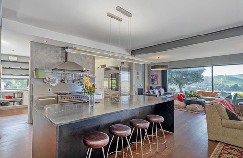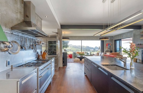 Meticulously designed with a clean industrial aesthetic and solid concrete construction, this villa is both stylish and robust. Inside, modern art and curated photography blend with cultural elements, including a striking Taniwha carving who watches over the home. The grand atrium, with its 8-metre high ceiling, antique Persian hand knotted mosque rug, and baby grand piano provides an inspiring space for yoga or pilates, while the main kitchen, with additional full preparation/ butlers kitchen, ensures seamless food preparation. Dine in style at the handcrafted tables made from heritage wind fallen old oak and Australian red gum, seating up to 16 guests.