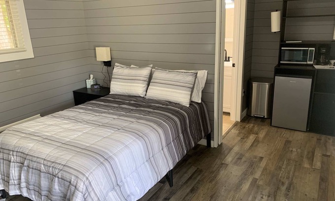 A cozy room that sleeps 1-2 guests with 1 double bed with clean sheets and a lightweight comforter. The room is stocked with essentials for coffee, mini fridge/freezer, microwave and extra shelves for storage. The private bathroom is stocked with toiletries and has a full shower w/bath tub. Enjoy your own AC/heating unit to adjust the temperature of your room to your liking. Tune into your favorite show or sports game on a flat screen TV and free WIFI for all streaming devices and accounts.