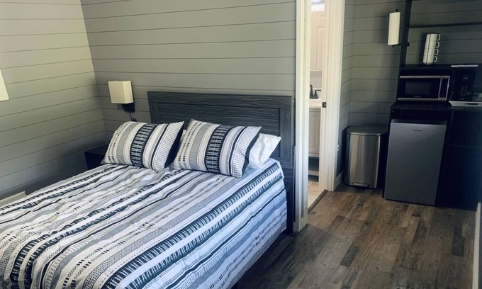 A cozy room that sleeps 1-2 guests with 1 double bed with clean sheets and a lightweight comforter. The room is stocked with essentials for coffee, mini fridge/freezer, microwave and extra shelves for storage. The private bathroom is stocked with toiletries and has a full shower w/bath tub. Enjoy your own AC/heating unit to adjust the temperature of your room to your liking. Tune into your favorite show or sports game on a flat screen TV and free WIFI for all streaming devices and accounts.