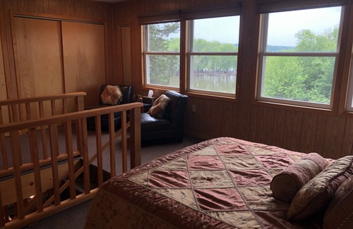 The loft bedroom boasts a wall of windows with amazing views of the Mississippi River.