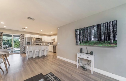 Tempe Joy House is located in a quiet neighborhood just blocks from ASU, the football stadium, and the vibrant Mill Avenue district. Recently updated, this modern retreat combines comfort and convenience with unique outdoor amenities designed for gathering and relaxation. Guests will love the newly remodeled backyard, featuring a fire pit, putting green, bocce ball, and multiple lounge areas, creating a sanctuary perfect for both short getaways and extended stays. Inside, every detail has been considered—from TVs in each bedroom to a fully stocked kitchen with complimentary coffee and teas.