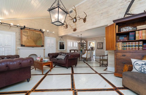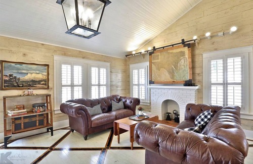 Step inside to discover a home that feels both special and comfortable. The welcoming living area features elegant whitewashed wood walls, handsome geometric-patterned floors, and sumptuous leather chesterfield sofas around a cozy brick fireplace. Distinctive Texas-inspired wall art and rustic antler accents add a touch of local character.