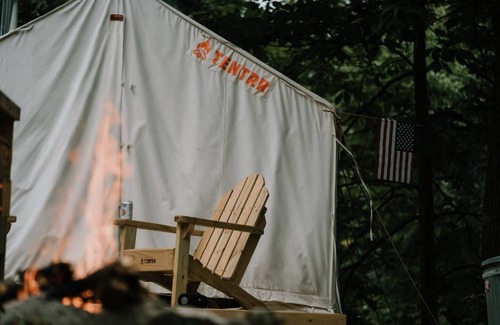 Your Tentrr campsite includes a 10'x12' (120 square feet) safari-style canvas tent on a raised wooden platform. Inside the tent you'll find one queen bed or a queen-size bunk bed (see photos for the exact setup). The tent is big enough for the bed plus one or two extra sleeping bags on the floor. Aside from the canvas tent, campers can also use the extra 5-person pop-up dome tent that’s provided. You'll also have a 6-ft picnic table, outdoor fire pit, 2 Tentrr Adirondack chairs, and a heating source to keep you warm and toasty at night.