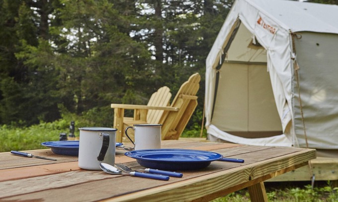 Your Tentrr campsite includes a 10'x12' (120 square feet) safari-style canvas tent on a raised wooden platform. Inside the tent you'll find one queen bed or a queen-size bunk bed (see photos for the exact setup). The tent is big enough for the bed plus one or two extra sleeping bags on the floor. Aside from the canvas tent, campers can also use the extra 5-person pop-up dome tent that’s provided. You'll also have a 6-ft picnic table, outdoor fire pit, 2 Tentrr Adirondack chairs, and a heating source to keep you warm and toasty at night.
