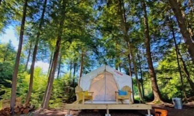 Your Tentrr campsite includes a 10'x12' (120 square feet) safari-style canvas tent on a raised wooden platform. Inside the tent you'll find one queen bed with a memory foam mattress. The tent is big enough for the bed plus one or two extra sleeping bags on the floor. Aside from the canvas tent, campers can also use the extra 5-person pop-up dome tent that’s provided. You'll also have a 6-ft picnic table, outdoor fire pit, and 2 Tentrr Adirondack chairs.