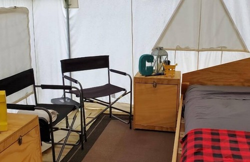 The main tent (anchored onto the wooden platform) - 1 x queen bed with air mattress & bedding (pillows, sheets, comforter & blanket, side tables, heat wood stove, 2 x lamps.