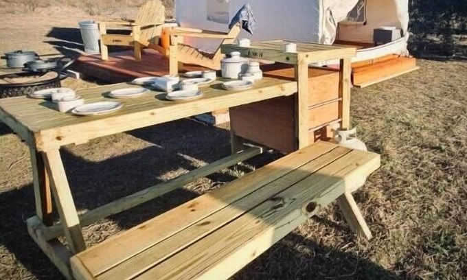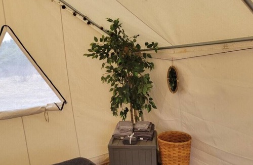 We have dishes, Pots and pans, cooler, games.. Sheet and blankets with pillows on bed. Lights and fan. Can even charger your phone. There potty john here or the ranch has shower and bathroom. Bring swimming suit for pool and hottub. We'll be adding water, and jacuzzi bathtub the deck. Have bath under the stars.