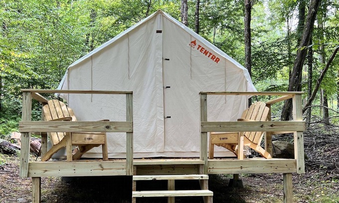 Your Tentrr campsite includes a 10'x12' (120 square feet) safari-style canvas tent on a raised wooden platform. Inside the tent you'll find one queen bed with a memory foam mattress. The tent is big enough for the bed plus one or two extra sleeping bags on the floor. Aside from the canvas tent, campers can also use the extra 5-person pop-up dome tent that’s provided. You'll also have a 6-ft picnic table, outdoor fire pit, 2 Tentrr Adirondack chairs, and a heating source to keep you warm and toasty at night.