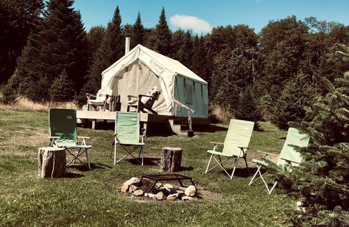 This Incredible site is located right in the middle of a Christmas tree farm, with amazing views overlooking a valley, a pond , hills, and forest. Nestled in the middle of on approximately 300 acres, your campsite is located at the top of a hill surrounded by beautiful Christmas trees and overlooking the farm. Take breathtaking hikes/walks around the tree farm, through the woods, around a large pond, or by a creek with cascading water. A beautiful & peaceful setting at just about every turn. We just added Horseback trail rides, Cart & Sleigh rides by appointment.Message me for more information. And close to many other possible adventures!( For your safety and ours we ask you bring your own Bedding).Close to waterfall, winery and Brewery.