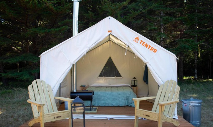 Each campsite includes a 10'x12' safari-style canvas tent on a raised platform, and you'll find one queen bed or a queen-size bunk bed inside (each site is different, see photos for the exact setup). Larger groups can also use the extra 5-person pop-up dome tent that’s provided (you’re welcome to bring your own camping gear too). You'll also have a 6-ft picnic table, outdoor fire pit, 2 Tentrr Adirondack chairs, and a heating source to keep you warm and toasty at night.