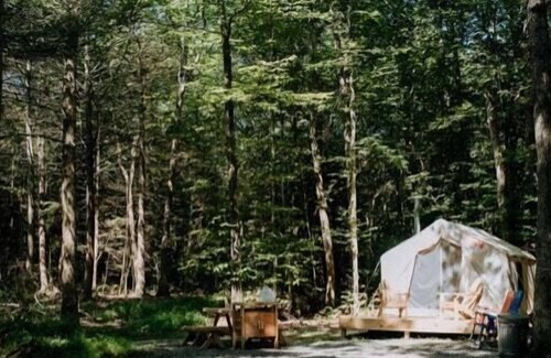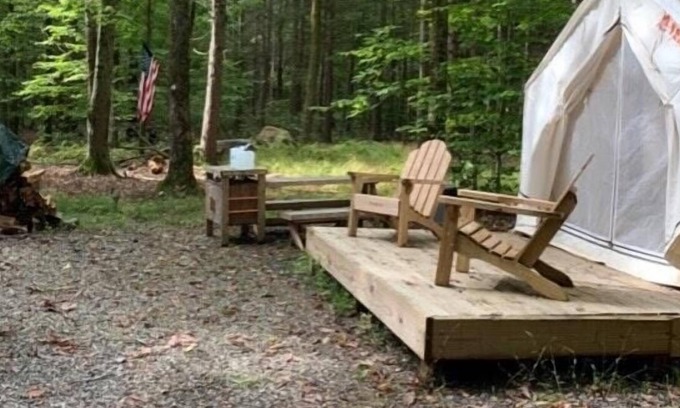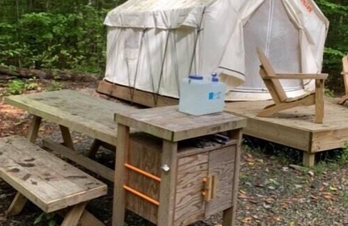 Each campsite includes a 10'x12' safari-style canvas tent on a raised platform, and you'll find one queen bed or a queen-size bunk bed inside (each site is different, see photos for the exact setup). Larger groups can also use the extra 5-person pop-up dome tent that’s provided (you’re welcome to bring your own camping gear too). You'll also have a 6-ft picnic table, outdoor fire pit, 2 Tentrr Adirondack chairs, and a heating source to keep you warm and toasty at night.