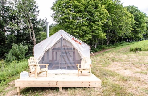 Your Tentrr campsite includes a 10'x12' (120 square feet) safari-style canvas tent on a raised wooden platform. Inside the tent you'll find one queen bed with a memory foam mattress. The tent is big enough for the bed plus one or two extra sleeping bags on the floor. Aside from the canvas tent, campers can also use the extra 5-person pop-up dome tent that’s provided. You'll also have a 6-ft picnic table, outdoor fire pit, and 2 Tentrr Adirondack chairs.
