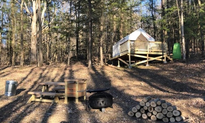 Each campsite includes a 10'x12' safari-style canvas tent on a raised platform, and you'll find one queen bed or a queen-size bunk bed inside (each site is different, see photos for the exact setup). Larger groups can also use the extra 5-person pop-up dome tent that’s provided (you’re welcome to bring your own camping gear too). You'll also have a 6-ft picnic table, outdoor fire pit, 2 Tentrr Adirondack chairs, and a heating source to keep you warm and toasty at night.
