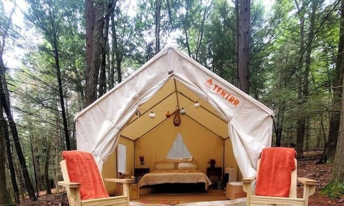 Your Tentrr campsite includes a 10'x12' (120 square feet) safari-style canvas tent on a raised wooden platform. Inside the tent you'll find one queen bed with a memory foam mattress. The tent is big enough for the bed plus one or two extra sleeping bags on the floor. Aside from the canvas tent, campers can also use the extra 5-person pop-up dome tent that’s provided. You'll also have a 6-ft picnic table, outdoor fire pit, 2 Tentrr Adirondack chairs, and a heating source to keep you warm and toasty at night.