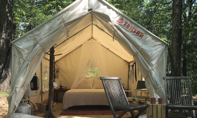 Your Tentrr campsite includes a 10'x12' (120 square feet) safari-style canvas tent on a raised wooden platform. Inside the tent you'll find one queen bed with a memory foam mattress. The tent is big enough for the bed plus one or two extra sleeping bags on the floor. Aside from the canvas tent, campers can also use the extra 5-person pop-up dome tent that’s provided. You'll also have a 6-ft picnic table, outdoor fire pit, and 2 Tentrr Adirondack chairs.