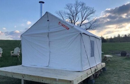 Your Tentrr campsite includes a 10'x12' (120 square feet) safari-style canvas tent on a raised wooden platform. Inside the tent you'll find one queen bed with a memory foam mattress. The tent is big enough for the bed plus one or two extra sleeping bags on the floor. Aside from the canvas tent, campers can also use the extra 5-person pop-up dome tent that’s provided. You'll also have a 6-ft picnic table, outdoor fire pit, and 2 Tentrr Adirondack chairs.