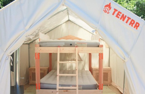 Each campsite includes a 10'x12' safari-style canvas tent on a raised platform, and you'll find one queen bed or a queen-size bunk bed inside (each site is different, see photos for the exact setup). Larger groups can also use the extra 5-person pop-up dome tent that’s provided (you’re welcome to bring your own camping gear too). You'll also have a 6-ft picnic table, outdoor fire pit, 2 Tentrr Adirondack chairs, and a heating source to keep you warm and toasty at night.