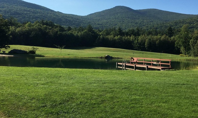 On-site, the mountain-fed pond is great for swimming and has cleaner water than most lakes. Enjoy the mowed field for games or sun.