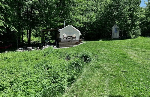There is a camp kitchen with essential utensils, cooking stove, cooler, potable water, and BBQ grill. Inside the tent is a memory foam queen mattress, two chairs, a small table and a wood stove. Linens, blankets, towels, wood, and charcoal provided. On site is a solar camp shower and an outhouse with composting toilet. There is plenty of seating on the deck and at the fire pit. We ask all guests to only use what they need and always respect nature so we can continue to offer this as an all inclusive site! Thorough cleaning of all surfaces a priority between stays.