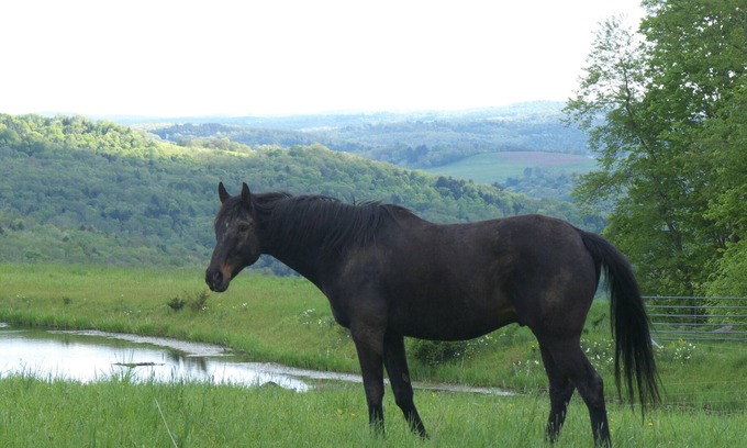 The campsite is tucked into a private meadow pocket edged by a tumbling hillside creek and waterfall, woods and my horse's favorite pasture, with views of the surrounding hillsides and river valley. The farm is home to herds of whitetail deer, wild turkeys, bull frogs, painted turtles and the occasional Snapper, visiting Canada Geese, Wood Ducks, Great Blue Herons and Red-tailed Hawks, my off-track-Thoroughbred, chickens, ducklings, and Aslan—my Cocker Spaniel rescue.