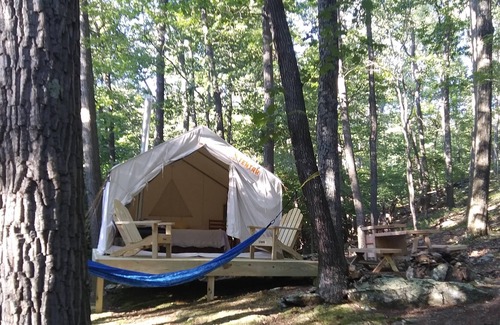 Each campsite includes a 10'x12' safari-style canvas tent on a raised platform, and you'll find one queen bed or a queen-size bunk bed inside (each site is different, see photos for the exact setup). Larger groups can also use the extra 5-person pop-up dome tent that’s provided (you’re welcome to bring your own camping gear too). You'll also have a 6-ft picnic table, outdoor fire pit, 2 Tentrr Adirondack chairs, and a heating source to keep you warm and toasty at night.
