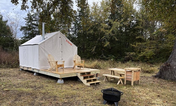 Your Tentrr campsite includes a 10'x12' (120 square feet) safari-style canvas tent on a raised wooden platform. Inside the tent you'll find one queen bed with a memory foam mattress. The tent is big enough for the bed plus one or two extra sleeping bags on the floor. Aside from the canvas tent, campers can also use the extra 5-person pop-up dome tent that’s provided. You'll also have a 6-ft picnic table, outdoor fire pit, and 2 Tentrr Adirondack chairs.