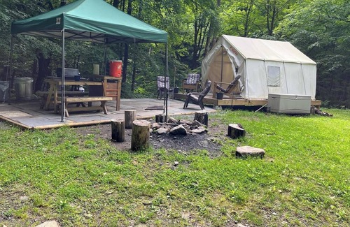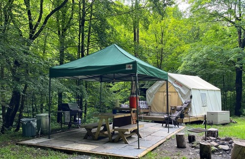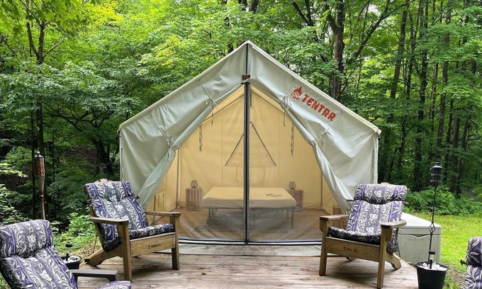 Each campsite includes a 10'x12' safari-style canvas tent on a raised platform, and you'll find one queen bed or a queen-size bunk bed inside (each site is different, see photos for the exact setup). Larger groups can also use the extra 5-person pop-up dome tent that’s provided (you’re welcome to bring your own camping gear too). You'll also have a 6-ft picnic table, outdoor fire pit, 2 Tentrr Adirondack chairs, and a heating source to keep you warm and toasty at night.