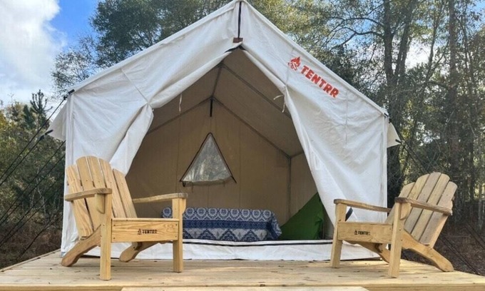 Your Tentrr campsite includes a 10'x12' (120 square feet) safari-style canvas tent on a raised wooden platform. Inside the tent you'll find one queen bed or a queen-size bunk bed (see photos for the exact setup). The tent is big enough for the bed plus one or two extra sleeping bags on the floor. Aside from the canvas tent, campers can also use the extra 5-person pop-up dome tent that’s provided. You'll also have a 6-ft picnic table, outdoor fire pit, 2 Tentrr Adirondack chairs, and a heating source to keep you warm and toasty at night.
