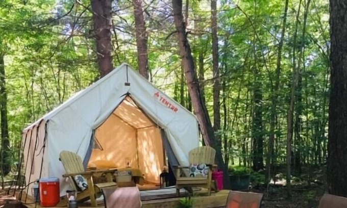 Each campsite includes a 10'x12' safari-style canvas tent on a raised platform, and you'll find one queen bed or a queen-size bunk bed inside (each site is different, see photos for the exact setup). Larger groups can also use the extra 5-person pop-up dome tent that’s provided (you’re welcome to bring your own camping gear too). You'll also have a 6-ft picnic table, outdoor fire pit, 2 Tentrr Adirondack chairs, and a heating source to keep you warm and toasty at night.