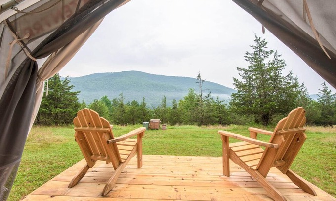 Your Tentrr campsite includes a 10'x12' (120 square feet) safari-style canvas tent on a raised wooden platform. Inside the tent you'll find one queen bed with a memory foam mattress. The tent is big enough for the bed plus one or two extra sleeping bags on the floor. Aside from the canvas tent, campers can also use the extra 5-person pop-up dome tent that’s provided. You'll also have a 6-ft picnic table, outdoor fire pit, and 2 Tentrr Adirondack chairs.