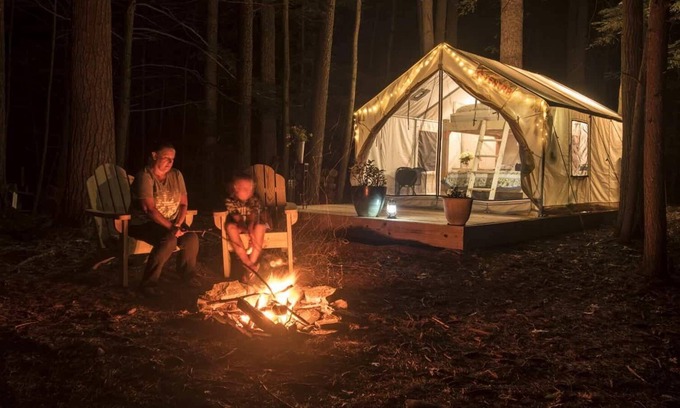 Your Tentrr campsite includes a 10'x12' (120 square feet) safari-style canvas tent on a raised wooden platform. Inside the tent you'll find one queen bed with a memory foam mattress. The tent is big enough for the bed plus one or two extra sleeping bags on the floor. Aside from the canvas tent, campers can also use the extra 5-person pop-up dome tent that’s provided. You'll also have a 6-ft picnic table, outdoor fire pit, and 2 Tentrr Adirondack chairs.
