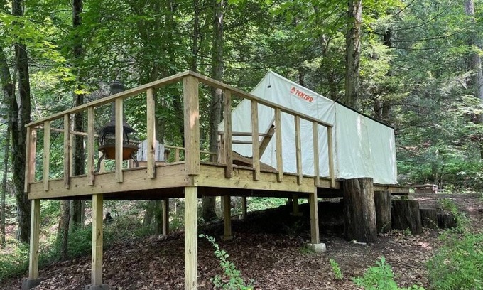 Each campsite includes a 10'x12' safari-style canvas tent on a raised platform, and you'll find one queen bed or a queen-size bunk bed inside (each site is different, see photos for the exact setup). Larger groups can also use the extra 5-person pop-up dome tent that’s provided (you’re welcome to bring your own camping gear too). You'll also have a 6-ft picnic table, outdoor fire pit, 2 Tentrr Adirondack chairs, and a heating source to keep you warm and toasty at night.