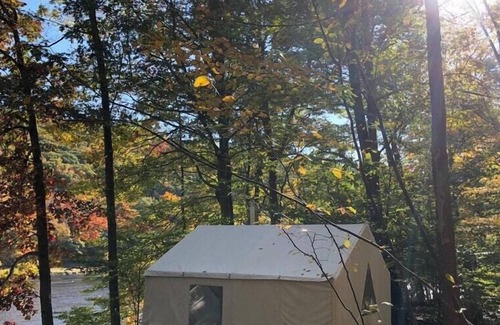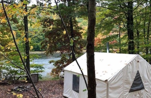Camp next to the majestic Delaware River in the comfort of a fully electrified and insulated tent. The ultimate romantic getaway is available year round. Tent includes carpeted and insulated floor, wood stove, electric heater, and real 8" thick foam mattresses. Across the road is our 5 bedroom farmhouse lodge, Slumberland at the River's Edge, which can be booked separately by request if you have extra guests or family that prefer indoor living. Don't see your dates? Make contact as we have many other camp sites and mountain cabins.