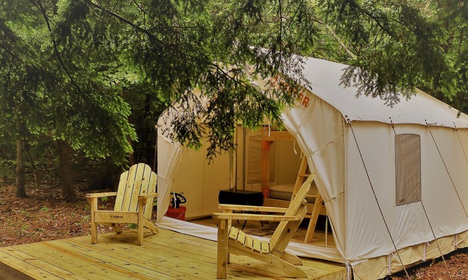 Each campsite includes a 10'x12' safari-style canvas tent on a raised platform, and you'll find one queen bed or a queen-size bunk bed inside (each site is different, see photos for the exact setup). Larger groups can also use the extra 5-person pop-up dome tent that’s provided (you’re welcome to bring your own camping gear too). You'll also have a 6-ft picnic table, outdoor fire pit, 2 Tentrr Adirondack chairs, and a heating source to keep you warm and toasty at night.