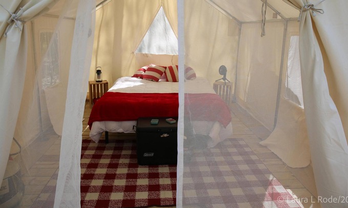 Strawberry Hill Campsite 1 accommodates up to 6 campers with 2 on the Queen bed in the 10' x 12' Safari platform tent and up to 4 additional campers in the included pop-up tent. For parents with toddlers or young children, the spacious canvas tent can fit a pack-n-play or even a twin air mattress next to the Queen bed. The Queen bed is outfitted with a 5" memory foam mattress; if you plan to use the pop-up tent, please bring sleeping bags and consider mats or air mattresses for comfort.