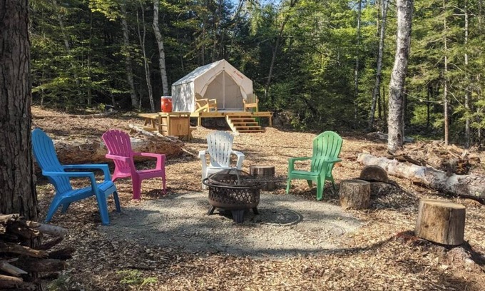 Your Tentrr campsite includes a 10'x12' (120 square feet) safari-style canvas tent on a raised wooden platform. Inside the tent you'll find one queen bed or a queen-size bunk bed (see photos for the exact setup). The tent is big enough for the bed plus one or two extra sleeping bags on the floor. Aside from the canvas tent, campers can also use the extra 5-person pop-up dome tent that’s provided. You'll also have a 6-ft picnic table, outdoor fire pit, and 2 Tentrr Adirondack chairs.