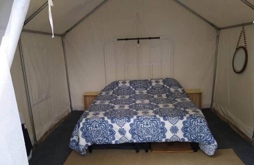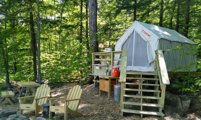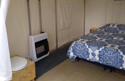 Your Tentrr campsite includes a 10'x12' (120 square feet) safari-style canvas tent on a raised wooden platform. Inside the tent you'll find one queen bed with a memory foam mattress. The tent is big enough for the bed plus one or two extra sleeping bags on the floor. Aside from the canvas tent, campers can also use the extra 5-person pop-up dome tent that’s provided. You'll also have a 6-ft picnic table, outdoor fire pit, 2 Tentrr Adirondack chairs, and a heating source to keep you warm and toasty at night.
